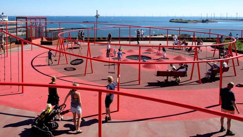 Konditaget Lüders is a one-of-a-kind activity park, located twenty-four metres above the ground in Nordhavn. It’s in a former industrial port of Copenhagen that was redeveloped into a dense, mixed-use waterfront neighbourhood. It’s so dense because the intent was to build a 5-minute city.