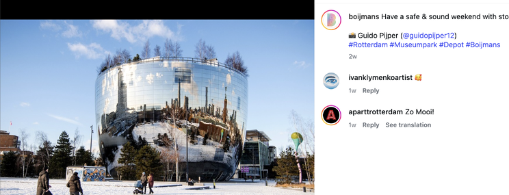 It was on our way to the hotel in Rotterdam that I first spotted the ovoid, bowl-like shape of this unique art building. It’s hard to resist the continuous mirrored surface wrapping the building and the large trees growing on top.